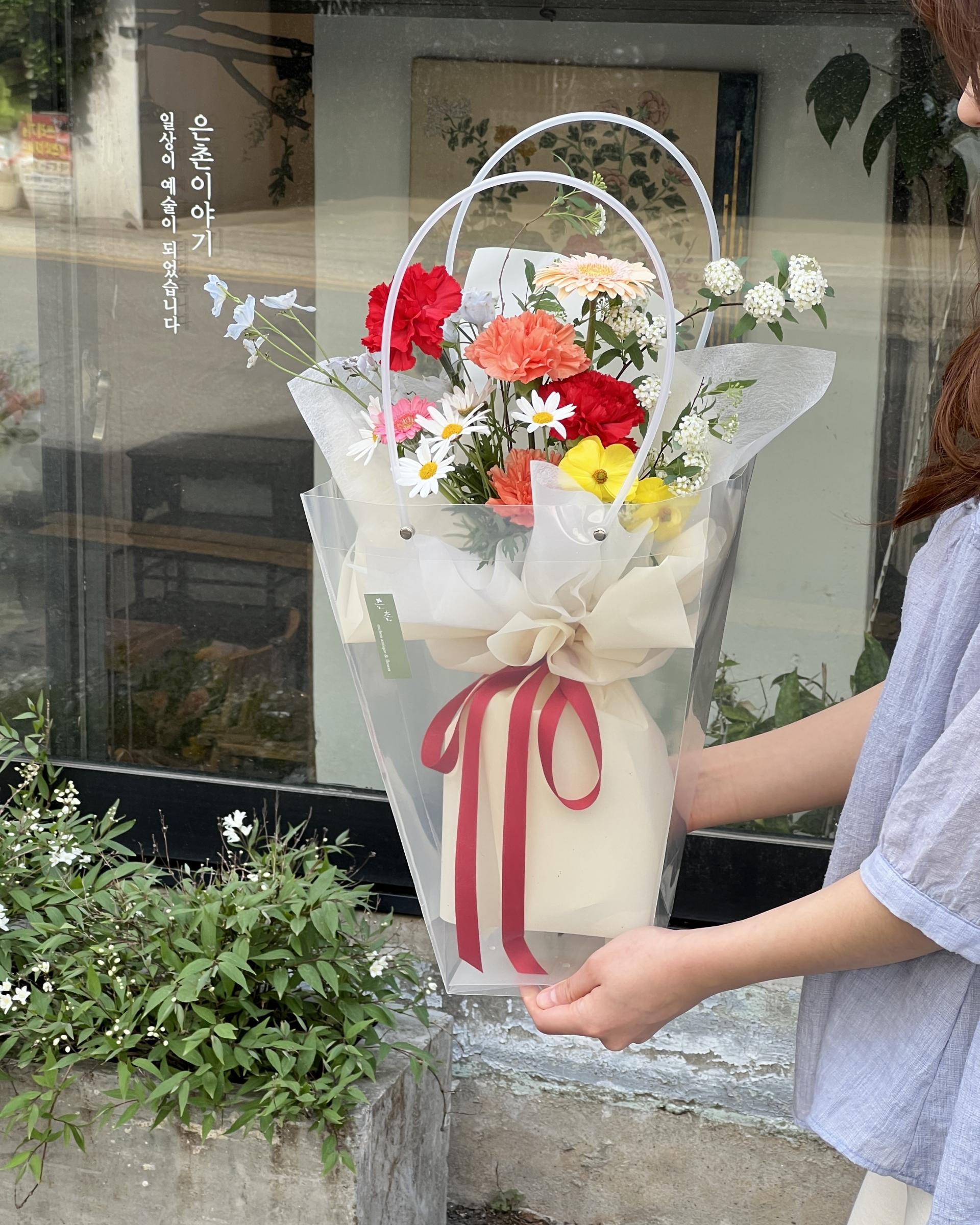 꽃다발을 튼튼한 투명 쇼핑백에 담아드립니다.